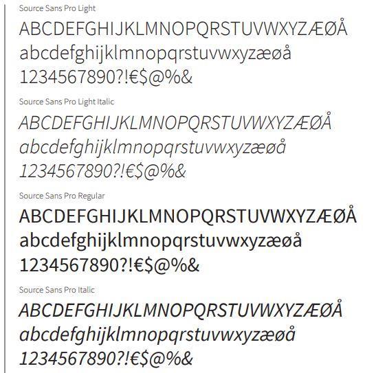 Styrken i typografien ligger i enkelheten i bokstavformene. Fontsnittet Source Sans Pro er en åpen font med lik strektykkelse i overgangene. I tillegg har den god over-/underlengde på bokstavene som gjør at fonten oppfyller kriteriene til lesbarhet og universell utforming.